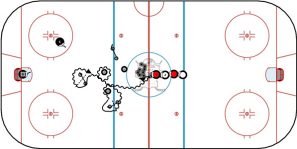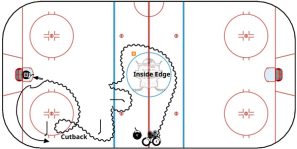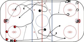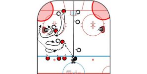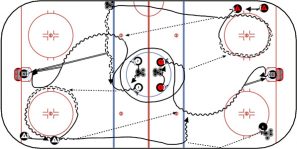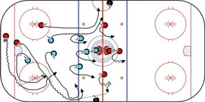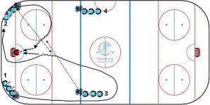 F1 picks up puck and passes to F2 who passes to F3. F2 curls from boards towards middle and F3 curls to boards from middle to outside. F3 goes in for shot then picks up…