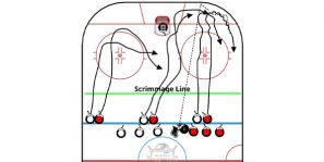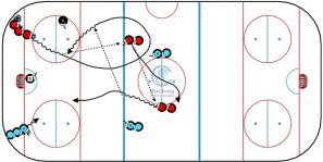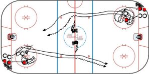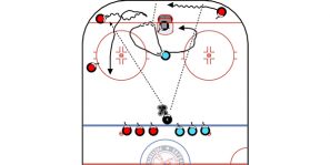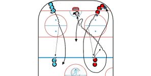 Coach chips puck behind D1 and D2. D2 must read the break out options. D4 has his stick on the ice in the first rep, so D2 calls for a quick up out of the…