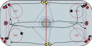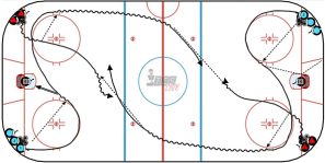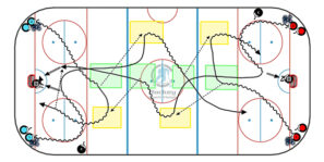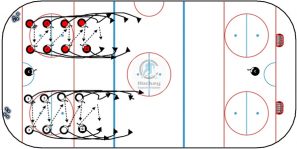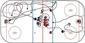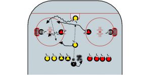 These drills require some thinking that allows the player to develop creative skills to utilize in different ways, depending on the situation. The small games used in this package are great for working into full-ice situations we meet in the games. There is a competing focus in these drills because training under stress is great…