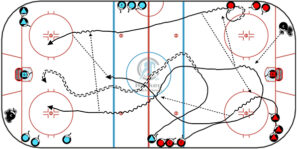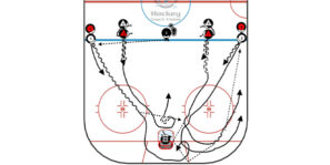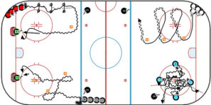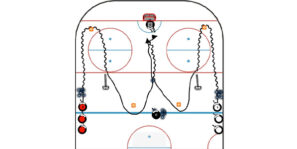 Position two lines of players in opposite corners. On the whistle, Player 1 and Player 2 skate up the ice from one corner, exchanging passes and finishing with a shot. After the shot, Player 3…